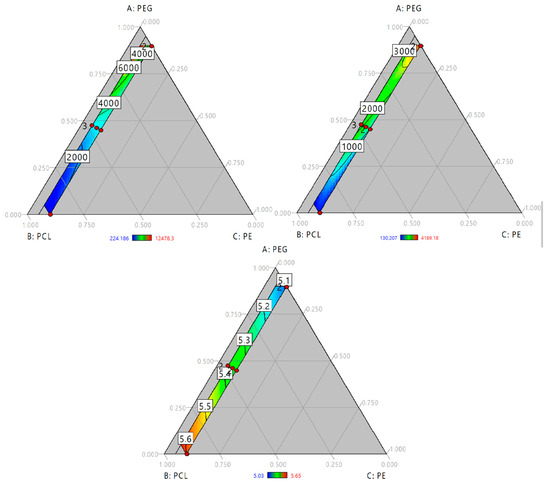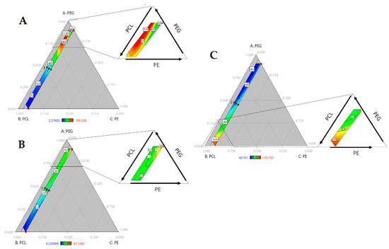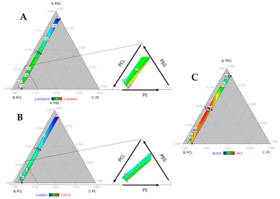 Ternary contour plots of (A) Modulus in MPa; (B) Tensile strength in MPa and (C) Shore A Hardness as function of PEG, PCL and PE mass fraction.