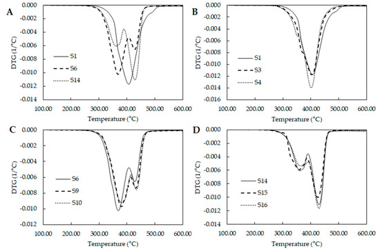 Figure 4A compares the behavior of samples from the extremes and middle of the experimental design. S1 seems to describe one degradation stage, while S6 and S14 shows two stages. S16 shows and increase on second stage compared with S6. Studying the curves from the extreme design points where PCL is the major component (Figure 4B), they present a shoulder around 350 °C. S1 have the largest amount of PE which produce PUs with large amount of hard segment. This could produce an overlapping of the three stages due to the large amount of PUs pyrolysis. S3 and S4 have lower levels of PE and they show better defined shoulders suggesting that the shoulder is the degradation of the hard segments.