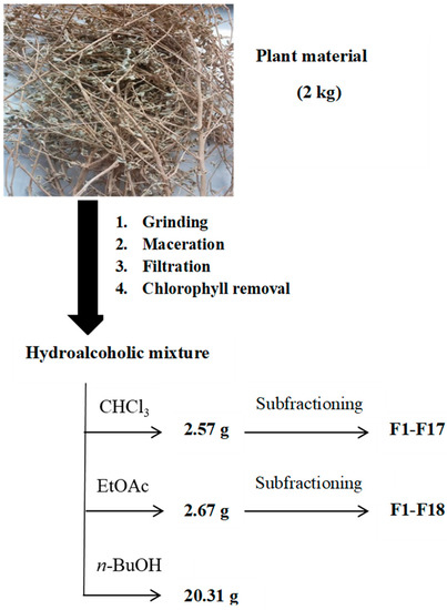 The chloroform extract was further fractionated by flash chromatography (MeOH/CHCl3, step gradients) to provide 17 fractions. Successively, the EtOAc extract was fractionated by flash chromatography (MeOH/CHCl3, step gradients) to provide 18 fractions (Figure 1). Each sample was stored in a sealed bag in the dark at −20 °C.