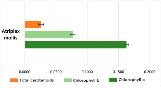 The previous phytochemical analyses of some Atriplex spp. reported the presence of several classes of secondary metabolites such as saponins, glycosides, flavonoids, tannins, terpenoids, alkaloids, and proteins as well as amino acids and long-chain alcohols. Additionally, no essential oils were found in these species, but they were characterized by high amounts of sulfur-derived compounds and minerals. Particularly, the content of proteins and amino acids changed during plant growth [9,10]. Compared with other species, and as far as our literature survey could reveal, no phytochemical investigations on Atriplex mollis Desf. aerial parts were previously reported. This prompted us to choose this species (widespread and endemic in Algeria) for an extensive phytochemical study with the aim of determining the main bioactive secondary metabolites (phenolics, carotenoids, and chlorophylls). Indeed, halophytes are well known for their ability to react with toxic reactive oxygen species, since they evolved an over-expressed antioxidant system and, as a response to abiotic stress, provide high levels of phenolic compounds [9]. Additionally, it was demonstrated that specific responses to salt stress adaptation in halophytic plants could be related to flavonoids, sulfolipids, and polyphenols over-production [11,12].
