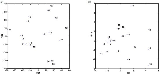Projection of molecules described by Dragon (a) and by Sybyl (b) parameters on plane defined by PC1 and PC2.