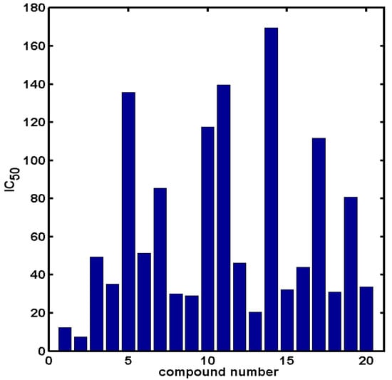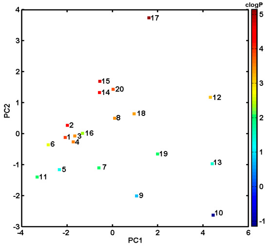 Drug-likeness is an idea that drug compounds differentiate from other molecules in their physical properties; therefore, a priori calculation of molecular descriptors (topological descriptors, structural fingerprint keys and other properties) is crucial for compound’s bioavailability and, hence, critical for the prospective drug candidate. Hence, a PCA technique for an ensemble of descriptors derived using Dragon 6.0 package was employed to the analysed compounds. All columns with constant or nearly constant values (standard deviation < 10−4) and with missing values have been eradicated from the initial number of selected parameters (4885) at the pre-processing stage resulting in the final set of 2797 descriptors. The final dataset was arranged in matrix X20×2797 with rows representing molecules (called objects) and columns representing numerical parameters (called variables) for further analysis. The efficient investigation of (dis)similarities between the studied objects requires simultaneous consideration of all calculated parameters. Thus, PCA was employed to visualize relevant differences in the performance of investigated molecules with respect to their structure and inhibitory profile. The analysis was performed for centred and standardized data, since the studied data library includes parameters of various orders of magnitude. The percentage of modelled variance was applied in the determination of the number of significant components (PCs). The PCA model with first three PCs described 79.78% of the total data variance, while the first two PCs accounted for 72.79%. Projecting objects on the planes defined by a few first principal components allows an interesting observation of the data structure. The analysis of score plot PC1 vs. PC2 in Figure 1a indicates that, basically, anticancer derivatives can be classified into groups according to the first principal component (describes 57.90% of the total variance). Roughly speaking, PC1 reveals variations between objects (molecules), where the test compounds are generally grouped together (PC1 > 20), confirming the trends observed in CoMFA/CoMSA modelling. Noticeable variations between molecules 11 and 12 encoded by a set of descriptors (parameters) confirm their mutual structural dissimilarity. Similarly, nine parameters (variables) calculated by the Sybyl software were gathered including count, volume, surface, Lipinski’s rule of five (Ro5) and lipophilicity descriptors (Table S1 in Supplementary Materials) to investigate variations within the ensemble of 20 anticancer derivatives. The compression of data slowly increased with the number of PCs that were included. The first two PCs account for 86.28% of the total data variance and it increases to ca. 93.28% for the third PC. The projection of objects on the plane defined by PC1 vs. PC2 component (Figure 1b) confirmed the tendency observed previously to cluster compounds of the test subpopulation (PC1 > 0). Interestingly, distant object no. 17 can be regarded as an outlier to the remaining ones along PC2 since it violates Ro5. Moreover, the inspection of compound lipophilicity colour-coded accordingly to calculated values of clogP detected that objects are clustered along PC2 (PC2 < −1) more or less according to their lipophilicity profile as illustrated in Figure 2. The projection of variables on the plane defined by first and second loadings for Dragon and Sybyl parameters is presented in Figure S1 (Supplementary Materials).