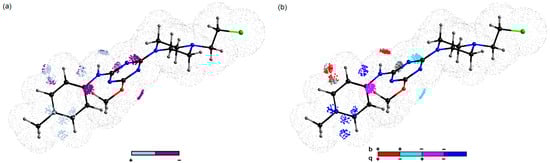 Molecular plots show spatial sectors of the greatest contribution to inhibitory potency retrieved from the best CoMSA model. Colours code the sign of influence (a). Four possible combinations of mean charge and correlation coefficient are colour-coded for charge descriptors (b). Compound 2 was plotted as a reference molecule.