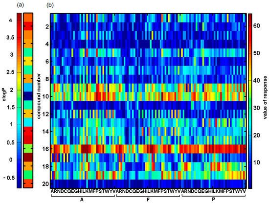Calculated lipophilicity profile (a) and ligand response values (b) obtained for set of 120 receptors (columns) and 20 compounds (rows).