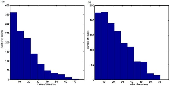 Histogram of response values for set of receptors with heptanoic (a) and decanoic (b) gating acids.