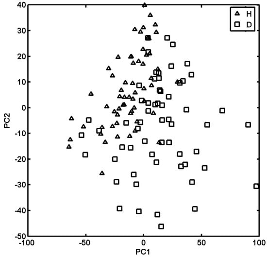 The elongation of the acid chain produces stronger guest-host interaction (the response values > 50 for 7.3% of decanoic vs. 4.2% of heptanoic gating acids) that can be roughly correlated with the acid lipophilicity profiles. Regarding the multivariate nature of the binding issue, PCA was employed to illustrate crucial variations in the performance of the artificial receptors with respect to their binding strength. The analysis was performed for centred and transposed data X120×20. The PCA model with three PCs described 68.53% of the total data variance, while the first two PCs account for 51.98% of the total data variance. First, let us examine the influence of the receptor design with respect to two different lipid residues, heptanoic (H) or decanoic (D), on its binding selectivity as illustrated in Figure 6.