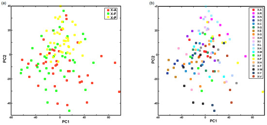 Projection of receptors on plane defined by first and second principal components with type of first (a) and second (b) residue used to build receptor structure.
