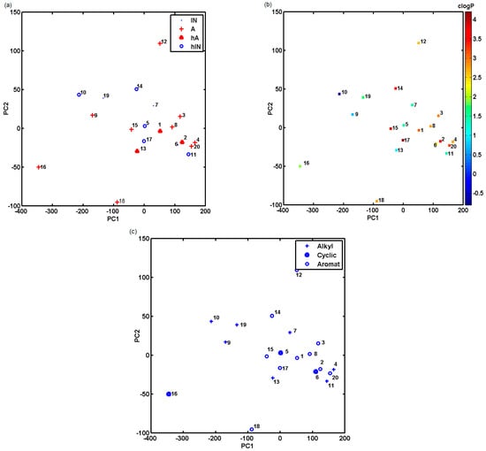 Basically, it can be expected that interactions between the target and the host ligands will be associated with the chemical structure of the receptor and the probe compound. Therefore, structurally similar ligands, namely, chemotypes should be retained similarly (comparable interaction strengths) by similar receptors, while diverse ligand structures would have different binding strengths, which would also induce dissimilar receptor answers. We also investigated the data set matrix with a collection of testing compounds as input objects (20 × 120). In this case, the first two principal components explained approximately 75.36% of the total data variance, while the set of three principal components accounted for nearly 84.58%. The analysis of the score plot PC1 vs. PC2 with the indicated activity compound profile (hA: IC50 < 25, A: 25 < IC50 < 50, IN: 50 < IC50 < 100, hIN: IC50 > 100) revealed the potency for the separation of biotypes along PC1, where highly active (hA) and active (A) ones are generally grouped together (PC1 > −100) as depicted in Figure 8a.