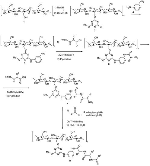 - Fraczyk, J.; Walczak, M.; Kaminski, Z.J. New methodology for automated SPOT synthesis of peptides on cellulose using 1,3,5-Triazine derivatives as linkers and as coupling reagents. J. Pep. Sci. 2018, 24. [Google Scholar] [CrossRef] [PubMed]