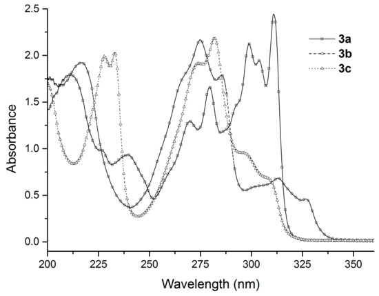 In the case of compounds 3a–c (Figure 1), the absorption spectral profile is quite different. In this case, two well-separated absorption regions were also observed (between 230–295 nm and 295–335 nm, respectively). For compounds 3b and 3c, as in the previous case, the absorption bands from the first region had a higher intensity (more than double) than the absorption bands from the second region. Regarding the maximum of the absorption of the compounds 3b and 3c, these appear in the first region, but in different bands. Thus, for compound 3b the absorption maximum appeared at 274.8 nm and a secondary band appeared around 285.4 nm, while for compound 3c the situation was reversed: the absorption maximum appeared at 281.8 nm and the secondary band appeared around 274.2 nm. Surprisingly, for compound 3a, the absorption spectrum was totally different. The absorption bands from the first region had a smaller intensity compared to the absorption bands from the second region. Accordingly, a bathochromic shift of the absorption maximum to 310.8 nm was observed.