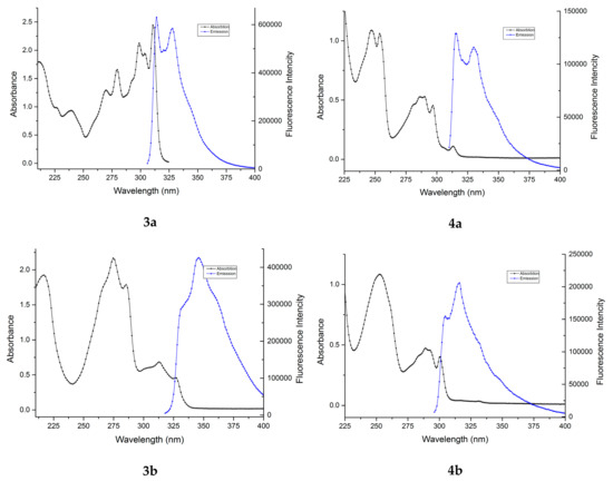 Figure 3 presents the absorption and emission spectra of compounds 3a–c and 4a–c in cyclohexane.