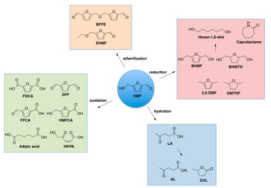 As a molecule platform chemical, 5-HMF permits to produce a large range of chemicals with different properties and utilities as solvents, fuel additives, materials, and multiple fine chemicals (Scheme 3). The main pathways of 5-HMF reactivity are etherification, reduction, hydration, and oxidation (Scheme 4).
