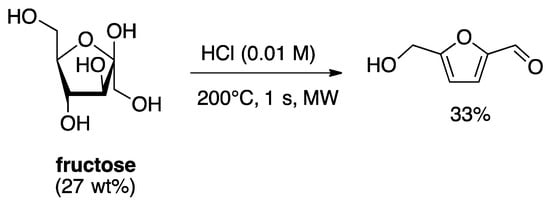 Riisager and co-workers studied the influence of different parameters on the dehydration of fructose in HCl aqueous solution under microwave heating []. Successively, they measured the impact of temperature, pH, microwave power, and residence time on the yield of the formed 5-HMF. Finally, the higher 5-HMF value was obtained with a diluted fructose solution (27 wt %) prepared with 0.01 M HCl solution and the liquid was warmed up at 200 °C for 1 s. In this process, a fructose conversion of 52% and 5-HMF yield of 33% were achieved (Scheme 6). With a longer reaction time (60 s vs. 1 s), fructose conversion and 5-HMF yield were 95% and 53%, respectively.