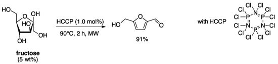 Wang and Xu demonstrated the potential of chlorinated organic heterocycle compounds such as hexachlorocyclo triphosphazine (HCCP) and cyarunic chloride (CNC) as a homogeneous acid catalyst for the dehydration of fructose into 5-HMF in mild conditions []. These reactions were carried out in DMSO to avoid the formation of suspected by-products. The organic solution containing HCCP (1 mol %) was heated at 90 °C for 2 h to afford the furanic counterparts with a maximum of yield of 91% (Scheme 9). By replacing HCCP with CNC, 5-HMF was produced in 87% yield using a similar process. The authors explain that P–Cl and C–Cl bonds of HCCP and CNC have strong interactions between the ketose and the electron-withdrawing substituent promoting the dehydration. The risks of such catalysts should be especially considered during the dehydration process.
