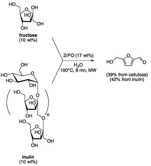 The use of supported and unsupported catalysts was studied for the production of 5-HMF []. Watanabe and co-workers tested sole titanium oxide (TiO2) and zirconium oxide (ZrO2) as catalysts for dehydration of both fructose and glucose into 5-HMF []. Usually, sugar (2 wt %) in water (5.0 mL) was heated at 200 °C for 1–10 min in the presence of 0.05 g of the catalyst. In case of fructose (2 wt %), the hot compressed water and selected heterogeneous catalysts TiO2 permitted to produce 5-HMF in 38% yield (conversion 84%) after 5 min of microwave heating. From glucose, 5-HMF could be also produced with 60% of yield and 50% of its conversion using ZrO2 as the catalyst in hot pressured water. The authors reported that ZrO2 acted as base and could promote the isomerization of glucose to fructose, whereas TiO2 could not only enhance the yield of 5-HMF, but also promote the isomerization step. Raspolli Galleti and co-workers employed niobium (NbPO) and zirconium phosphate (ZrPO) catalyst to dehydrate fructose and enulin in water under microwave heating without the addition of an extraction solvent []. NbPO and ZrPO present different acidic properties: amount of total acidic sites, Bronsted/Lewis acid ratio, and acidic strength. The optimal conditions were determined and fructose or inulin (10 wt %) aqueous solutions were heated at 190 °C for 8 min to give 41% and 43% of 5-HMF selectivity, respectively, in the presence of ZrPO as catalyst (Scheme 12). Interestingly, NbPO was found to be less active in the same conditions.