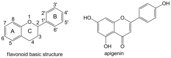 One of the most abundant and most studied flavonoids is 4′,5,7-trihydroxyflavone, commonly known as apigenin (Figure 1). Apigenin is found in significant quantities in a variety of natural foods such as parsley, chamomile, oranges, celery, thyme, onions, honey, and bee pollen [8,9]. Interest in apigenin has grown in recent years due to its low intrinsic toxicity and remarkable effects on cancerous cells [10,11]. It is increasingly recognized that apigenin can be a chemopreventive agent of cancer [8,9,11]. It has been reported that apigenin can promote adverse metabolic reactions in vivo when consumed as part of a normal diet [10]. These beneficial effects could be largely attributed to its potent antioxidative activities [11].