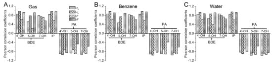 The Pearson correlation coefficients between the Hammett sigma constants, the field/inductive parameter and resonance parameter with the PAs are drawn as histograms in Figure 2. As can be seen in Figure 2, all of the P (PA, σ) were negative. Besides, the absolute values of the P (PA, σ) were all larger than 0.8, indicating that the PAs were negatively and highly relevant with the Hammett sigma constants. The negative coefficient also suggested that the electron-withdrawing groups reduced the O-H PA and the electron-donating groups had the opposite effect. Therefore, the electron-withdrawing groups at the C3 position strengthened the antioxidative activity of apigenin while the electron-donating groups had the opposite effect in the SPLET mechanism.