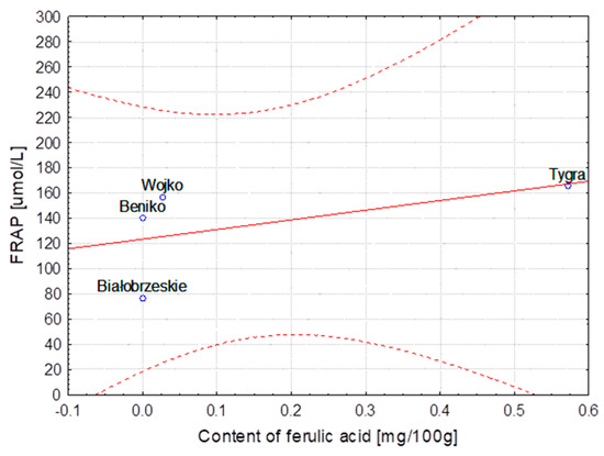 Variety of flax MODRAN—Dependence of FRAP [μmol/L] vs. content of ferulic acid [mg/100 g] (y = 60.187 + 77.556x; C = 95%).