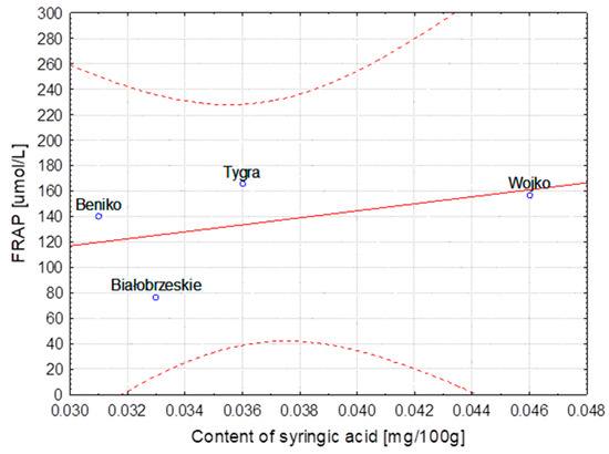 Variety of flax MODRAN—Dependence of FRAP [μmol/L] vs. content of syringic acid [mg/100 g] (y = 72.254 + 1875.476x; C = 95%).