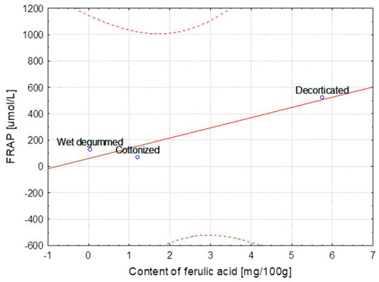 Method extraction of hemp—Dependence of FRAP [μmol/L] vs. content of ferulic acid [mg/100 g] (y = 87.057 + 64.243x; C = 95%).