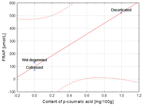 Variety of flax MODRAN—Dependence of FRAP [μmol/L] vs. content of p-coumaric acid [mg/100 g] (y = 100.070 + 425.055x; C = 95%).