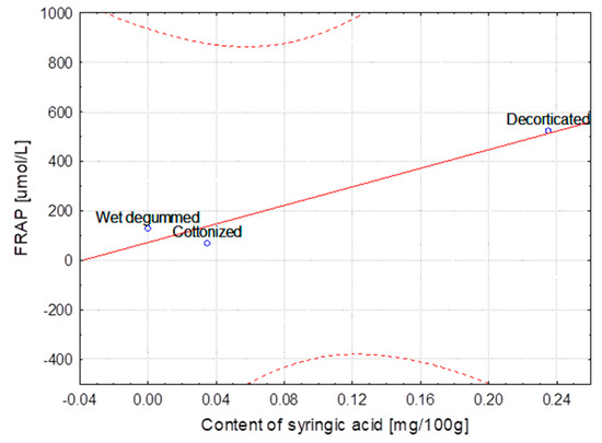 Method extraction of hemp—Dependence of FRAP [μmol/L] vs. content of syringic acid [mg/100 g] (y = 43.999 + 810.796x; C = 95%).