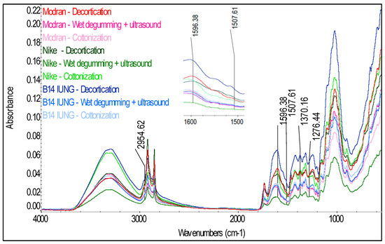 Due to the fact that the tested phenolic compounds such as: syringic, p-coumaric, sinapinic and ferulic acids are found in lignin in the fibers, they should be detected in the IR spectrum in the bands characteristic for the lignin, described in Table 2. The spectra (Figure 7, Figure 8 and Figure 9) of the tested fibers represent in detail the bands specific for lignin at the absorption of 1500–1600 cm−1, from C=C bonds for the phenolic group. The analysis of the spectra indicated that the highest intensity of the signal for the flax (Figure 7) were observed for the decorticated fibers and the lowest for the fibers after the wet-degumming combined with ultrasound. In the case of hemp varieties (Figure 8) the highest intensity of the signal was found for the Tygra fibers and the lowest for the Beniko fibers. The analysis of the hemp fiber spectra (Figure 9) showed that the processes carried out in water i.e., the wet degumming combined with ultrasound and the osmotic degumming, caused decreased signals for the C=C bond in the aromatic ring. The decortication method turned out to be the mildest, where both the lignin (Table 1) and phenolic compounds content (Table 2) was the highest, for both flax and hemp fibers. This dependence is also visible in the signals from C-H3 bond at 2954–1970 cm−1 and 1370–1373 cm−1 and from C-H bond at 1271–1278 cm−1. The band characteristic for pectin includes stretching vibrations from the carboxylic group COO bond at 1418 and 1424–1426 cm−1.