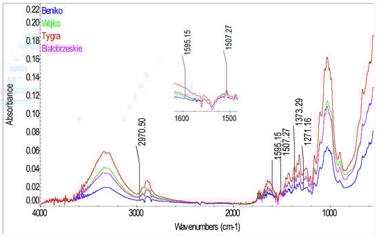 Significant differences can be observed for the spectra in the absorbance range of 2800–3000 cm−1 (C-H, C-H2, C-H3 stretching), where for the tested fibrous flax varieties two distinct spectra were found at the ranges of 2915–2923 and 2841–2848 cm−1 while for the hemp varieties at the ranges of 2895–2897 and 2939 cm−1.