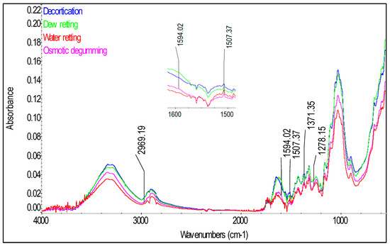 Lignin is a polymer, monomers of which are organic compounds derived from phenolic alcohols. The most characteristic spectra for he lignin are symmetrical stretching vibrations for the C=C bond, from the aromatic ring at the absorbance of 1593–1595 and 1507–1508 cm−1 [21]. The spectra characteristic for lignin are also stretching vibrations from C-H3 bond in the range of 2954–2970 cm−1, symmetrical deforming vibrations from C-H3 bonds at 1370–1373 cm−1 and bending vibrations for the C-H bond at 1271–1278 cm−1 [21]. Importantly, the signal from the bending vibration for the C-H group was observed only for the spectra of the dew retted flax fibers.