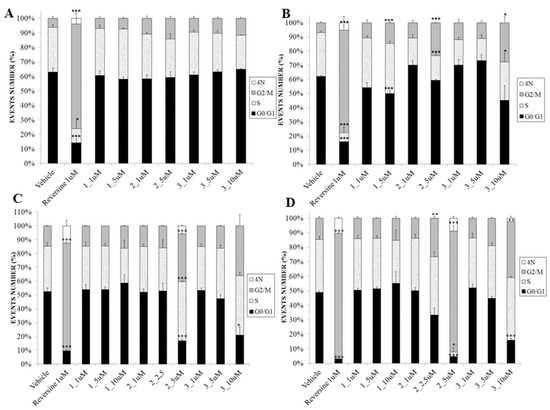 Cell cycle analysis after treatments with compounds 1–3 at different concentrations on: (A) MCF-7 Vector; (B) MCF-7shp53; (C) HCT116p53+/+ and (D) HCT116p53−/−. The results are expressed as mean ± SEM of three independent experiments (* p-value < 0.05; ** p-value < 0.01; *** p-value < 0.005).