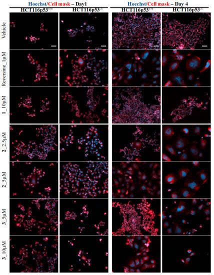 A plasma membrane staining was then performed to analyze the effect of the molecules at a morphological level. MCF-7 and HCT116 cell lines were stained and analyzed by fluorescence microscopy upon one and four days of treatment with reversine and 1–3 (0.1% DMSO was used as control). Treated MCF-7 cells were larger in size and their number was lower with respect to the control. Furthermore, as shown by 4′,6-diamidino-2-phenylindole (DAPI) staining, many cells presented several nuclei, fused together (Figure S8). This is probably due to the inability to form two separate nuclei during M phase of the cell cycle. Cells could then bypass the G2/M checkpoint by avoiding cell division, therefore generating two fused nuclei inside the same cell. This loop then continues until the cells undergo apoptosis [27,28]. In accordance with data obtained by flow cytometry, this effect was higher in MCF-7shp53 with respect to MCF-7 control cells. Specifically, compound 2 at a 5 µM concentration caused a stronger effect when p53 was down-regulated, while compound 3 at a 10 µM concentration caused cell cycle arrest and endoreduplication only in MCF-7shp53 cells. This result provides an additional confirmation of cell cycle arrest in G2/M phase, probably caused by incorrect mitotic spindle formation and chromosome segregation. Accordingly, similar effects were obtained in HCT116 cells. Specifically, 2.5 µM of 2 and 5 µM of 3 caused cell cycle arrest and endoreduplication in HCT116p53−/− cells but not in HCT116p53+/+ cells, with morphological changes more visible at day 4 with respect to day1 (Figure 3).