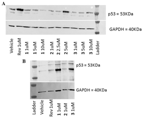 Western blot analysis to determine p53 expression after one day of treatment with different concentration of reversine and compounds 1–3 on A MCF-7 Vector and B HCT116p53+/+.