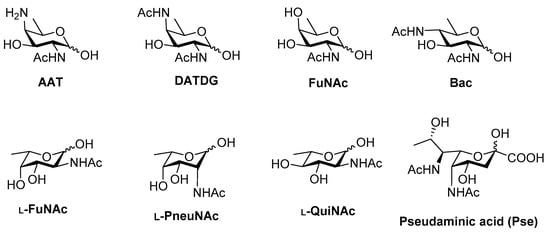 - Morrison, M.J.; Imperiali, B. The Renaissance of Bacillosamine and Its Derivatives: Pathway Characterization and Implications in Pathogenicity. Biochemistry 2014, 53, 624–638. [Google Scholar] [CrossRef] [PubMed]