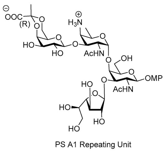 - Eradi, P.; Ghosh, S.; Andreana, P.R. Total Synthesis of Zwitterionic Tetrasaccharide Repeating Unit from Bacteroides fragilis ATCC 25285/NCTC 9343 Capsular Polysaccharide PS A1 with Alternating Charges on Adjacent Monosaccharides. Org. Lett. 2018. [Google Scholar] [CrossRef] [PubMed]