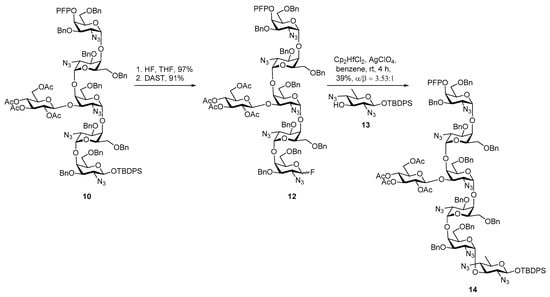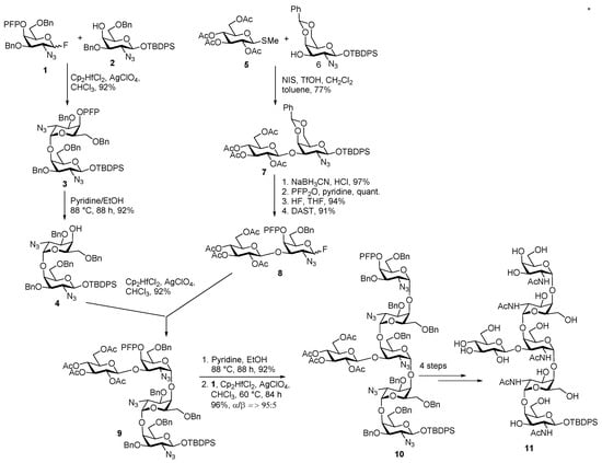 - Ishiwata, A.; Ohta, S.; Ito, Y. A Stereoselective 1,2-Cis Glycosylation toward the Synthesis of a Novel N-Linked Glycan from the Gram-Negative Bacterium, Campylobacter Jejuni. Carbohydr. Res. 2006, 341, 1557–1573. [Google Scholar] [CrossRef] [PubMed]