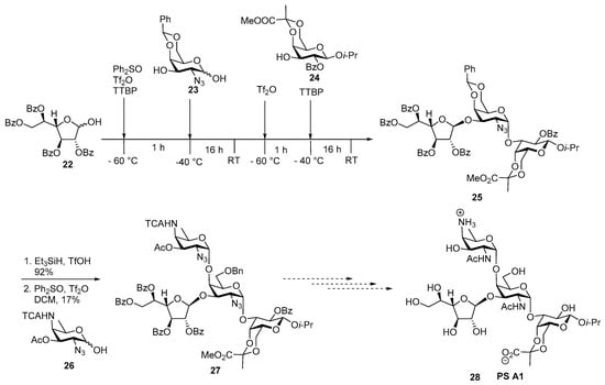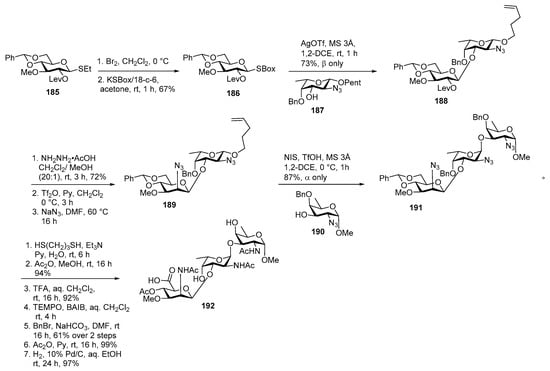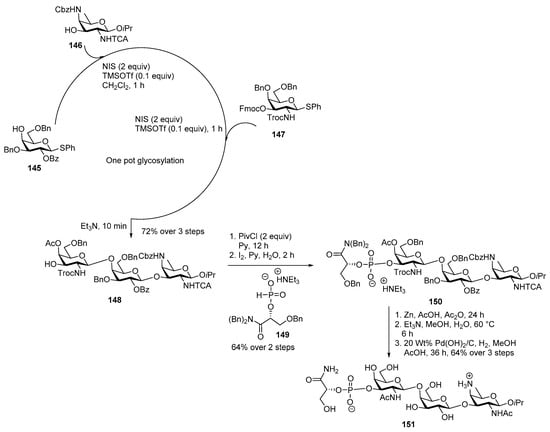 - Podilapu, A.R.; Kulkarni, S.S. Total Synthesis of Repeating Unit of O-Polysaccharide of Providencia Alcalifaciens O22 via One-Pot Glycosylation. Org. Lett. 2017, 19, 5466–5469. [Google Scholar] [CrossRef] [PubMed]