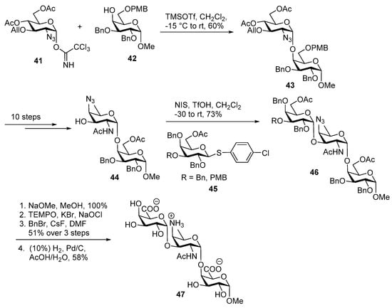 - Ghosh, S.; Nishat, S.; Andreana, P.R. Synthesis of an Aminooxy Derivative of the Tetrasaccharide Repeating Unit of Streptococcus dysgalactiae 2023 Polysaccharide for a PS A1 Conjugate Vaccine. J. Org. Chem. 2016, 81, 4475–4484. [Google Scholar] [CrossRef] [PubMed]