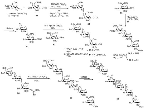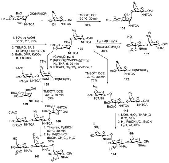 - Gagarinov, I.A.; Fang, T.; Liu, L.; Srivastava, A.D.; Boons, G.J. Synthesis of Staphylococcus Aureus Type 5 Trisaccharide Repeating Unit: Solving the Problem of Lactamization. Org. Lett. 2015, 17, 928–931. [Google Scholar] [CrossRef] [PubMed]