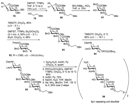 - Wu, X.; Cui, L.; Lipinski, T.; Bundle, D.R. Synthesis of Monomeric and Dimeric Repeating Units of the Zwitterionic Type 1 Capsular Polysaccharide from Streptococcus Pneumoniae. Chem. Eur. J. 2010, 16, 3476–3488. [Google Scholar] [CrossRef] [PubMed]
