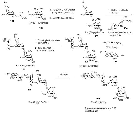 - Seeberger, P.H.; Pereira, C.L.; Govindan, S. Total Synthesis of a Streptococcus Pneumoniae Serotype 12F CPS Repeating Unit Hexasaccharide. Beilstein J. Org. Chem. 2017, 13, 164–173. [Google Scholar] [CrossRef] [PubMed]