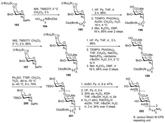 - Hagen, B.; Van Dijk, J.H.M.; Zhang, Q.; Overkleeft, H.S.; Van Der Marel, G.A.; Codée, J.D.C. Synthesis of the Staphylococcus Aureus Strain M Capsular Polysaccharide Repeating Unit. Org. Lett. 2017, 19, 2514–2517. [Google Scholar] [CrossRef] [PubMed]