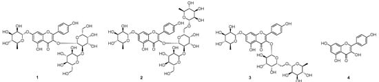 The phytochemical investigation of the seeds of L. culinaris lead to the isolation of compounds 1–3. Their structures were identified as kaempferol-3-O-β-gulcopyranosyl-(1→2)-β-galactopyranosyl-7-O-α-rhamnopyranoside (1) [16], kaempferol-3-O-β-gulcopyranosyl-(1→2)-[α-rhamnopyranosyl(1→6)]-β-galactopyranosyl-7-O-α-rhamnopyranoside (2) [17], and robinin (kaempferol-3-O-α-rhamnosyl(1→6)-O-β-galactopyranoside-7-O-α-rhamnopyranoside; 3) [17], via analysis of their spectroscopic data, as well as comparisons, of their data with published values, as shown in Table S1 and Figure 1.