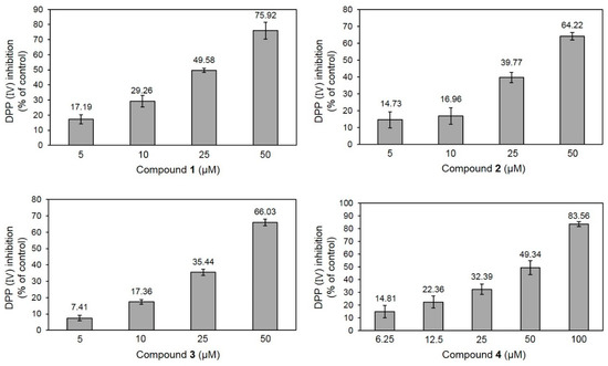 Effects of compounds 1–4 on dipeptidyl peptidase IV (DPP-IV) activity. Values are presented as the mean ± SD of three independent experiments.
