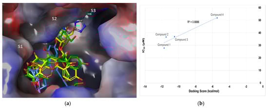 (a) The binding poses of all docked compounds in the binding pockets/active sites of human dipeptidyl peptidase IV. The binding pockets/active sites are labeled as S1, S2, and S3 (light grey). They are shown on the electrostatic surface. Sitagliptin is shown partially bound in the S3 pocket (grey atom-colored stick), and compounds 1 (yellow), 2 (green), 3 (light blue), and 4 (pink) are all docked into the wide S1 and S2 pockets. (b) Linear correlation between the docking scores and IC50 values, with R2 = 0.8886 for compounds 1–4.