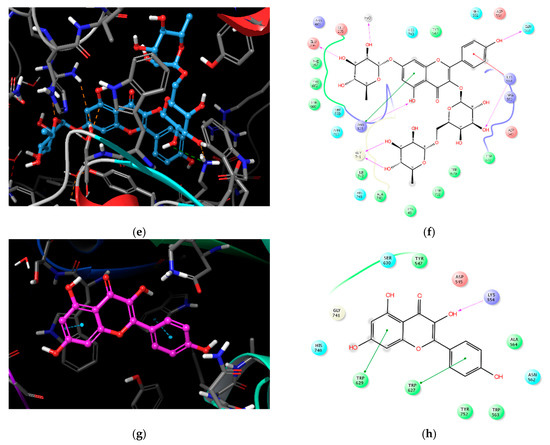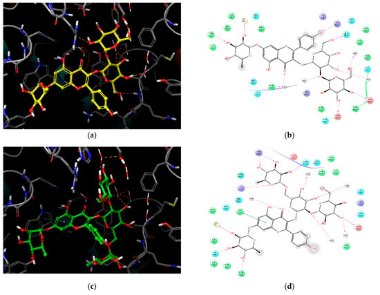 Compound 3, which is structurally similar to compound 1, docked into the S1 and S2 pockets, with a docking score of −10.494 kcal/mol (Table 1 and Figure 4e,f). The difference in the sugar moieties rhamnopyranoside and galactopyranoside, explained the difference in interactions, compared with the findings for compound 1. The orientation of the flavone core slightly differed from that of 1 and 2, due to the hydrophilic interactions with residues in the S1 pocket of the 3 position in rhamnopyranoside and galactopyranoside. Conversely, the sugar moieties in the 3 position of compounds 1 and 2, were positioned mainly within the S2 pocket, stretching out toward S3.