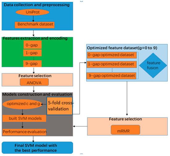 In this work, we investigated the accuracies of different features for identifying phage virion proteins. The maximum overall accuracy (87.95%) was obtained by fusing 10 optimal g-gap (0 to 9) dipeptide compositions, which was obtained by fusing ANOVA and mRMR feature selection methods. Compared with the existing methods, the proposed model improved the overall accuracy. Therefore, the method can be used as a reliable tool for accurately predicting phage virion proteins. In our study, there are many problems worth investigating for phage virion protein prediction. For example, in order to build a high quality dataset, greater attention should be paid to the dynamic changes of the database. Second, the biological meanings of the selected optimal features also need to be clarified. Third, considering the promising performance of the ensemble classification methods [55] and the deep learning technique [56,57,58] in bioinformatics, we will integrate multiple classification algorithms to build the model for identifying phage virion proteins. User-friendly and publicly accessible web tools including predictors [25,27,50,59,60] or databases [61,62,63,64] represent the future direction for developing a more useful bioinformatics method. In the future, we will establish a powerful tool for phage virion protein prediction. The feature selection strategy can be extended to other fields.