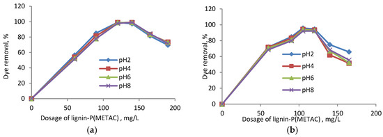 The interaction between dye and polymer segments can be affected by the pH of the effluent wastewater [23]. The impacts of the dosage of lignin-METAC (sample 4) and the pH of the solution on the dye removal are shown in Figure 1. Regardless of the pH, the dye removal efficiency reached a maximum at 120 mg/L and 105 mg/L of lignin-METAC concentration for RB5 and RO16, respectively. In this case, the sulfonate groups (i.e., anionic groups) of the dye were neutralized by the cationic ammonium groups of lignin-METAC polymer forming large flocs that settled [34]. When the concentration of lignin-METAC polymer was higher than 150 mg/L for RB5 and 120 mg/L for RO16, more lignin-METAC interacted with the dye segments generating coagulates that were probably positively overcharged by lignin-METAC. These coagulates could repel each other in the solutions as they had a net charge. The balance of the repulsion of the coagulates in the solutions would yield the stabilization of the coagulates (and thus, dye segments) in the solutions, decreasing the dye removal efficiency [24].