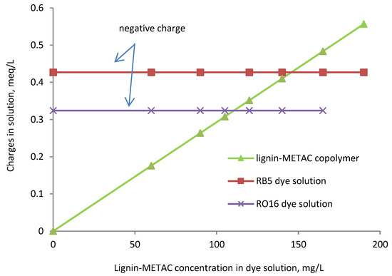 The total cationic charge (meq/L) of lignin-METAC polymer in the dye solution was determined and is shown in Figure 2. The total cationic charges introduced to the solution were increased by the addition of the lignin polymer into the solution. Charge neutralization, i.e., point of zero charge, will occur when the total number of charges introduced by the polymer will be equal to the total charges of the dye in the solutions (i.e., the crossing points of lignin-METAC line and dye line shown in Figure 2). This point corresponds to the lignin-METAC concentration of 145.7 mg/L for RB5 and 110 mg/L for RO16, respectively. The optimal experimental concentration of lignin-METAC was 120 mg/L for RB5 and 105 mg/L for RO16 (Figure 1), respectively, which is lower than that of the theoretical concentrations (Figure 2). This provides evidence that, in addition to charge neutralization, other factors, such as bridging, contributed to the interaction of lignin-METAC with the dye molecules in the solutions [25,26,27].