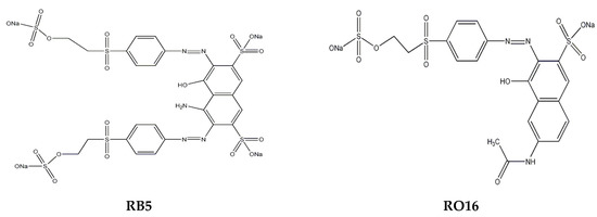 It is also apparent that a lower dosage of lignin-METAC polymer was needed to remove RO16 than RB5. This higher efficiency is most likely attributed to the different molecular structures and charge densities of RB5 and RO16. As shown in Figure 3, RO16 has two sulfonate groups, while RB5 contains four sulfonate groups, requiring a higher concentration of lignin-METAC polymer to neutralize its charge. A similar phenomenon has also been observed by Szygula and coworkers in removing sulfonated azo-dyes by using chitosan from solutions [23].