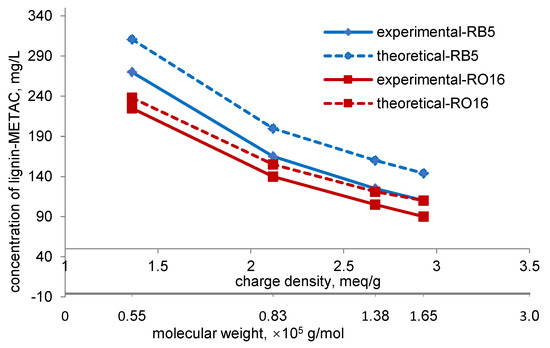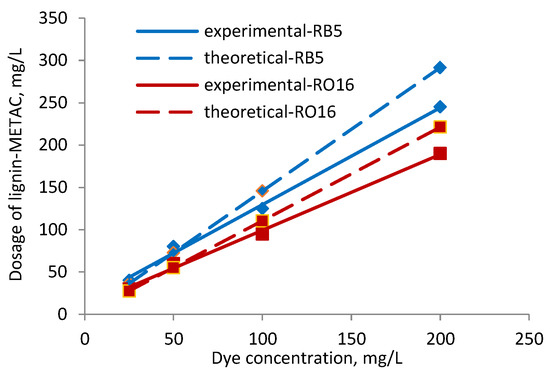 Based on the charge densities of the dyes in Table 2 and that of the lignin-METAC in Table 1, the concentration of lignin-METAC polymer that could result in a maximum dye removal was determined and is shown as a function of dye removal in Figure 7. The concentration of lignin-METAC to obtain the maximum dye removal was 270 mg/L, 165 mg/L, 125 mg/L, and 110 mg/L for RB5 and 225 mg/L, 140 mg/L, 105 mg/L, and 90 mg/L for RO16 for samples 1 to 4, respectively. Interestingly, the concentration of lignin-METAC used experimentally was lower than that required theoretically to interact with the dyes, which was due to the bridging effect of dyes as the bridging effect is discounted in the theoretical estimation. Moreover, the higher the charge density and molecular weight of lignin-METAC, the larger difference there was between the experimental and theoretical concentrations, further illustrating that the bridging effect was more pronounced when the polymer had a higher molecular weight. The bridging effect in dye removal from wastewater has also been reported in the literature when removing acid violet 5, methyl orange, and acid black 1 from dye wastewater [21,27,36].